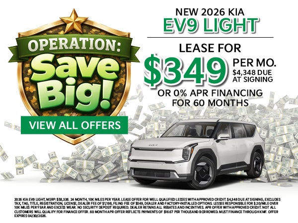 2026 Kia EV9 Light, MSRP: $58,338. 24 MONTH, 10K MILES PER YEAR. LEASE OFFER FOR WELL QUALIFIED LESSES WITH APPROVED CREDIT. $4,348 DUE AT SIGNING, EXCLUDES TAX, TAG, TITLE, REGISTRATION, LICENSE, DEALER FEE OF $1,198, FILING FEE OF $549, DEALER AND FACTORY-INSTALLED OPTIONS. LESSEE RESPONSIBLE FOR $.20/MILE OVER 10K MILES PER YEAR AND EXCESS WEAR. NO SECURITY DEPOSIT REQUIRED. DEALER RETAINS ALL REBATES AND INCENTIVES. APR OFFER WITH APPROVED CREDIT. NOT ALL CUSTOMERS WILL QUALIFY FOR FINANCE OFFER. 60 MONTH APR OFFER REFLECTS PAYMENTS OF $16.67 PER THOUSAND BORROWED. MUST FINANCE THROUGH KMF. OFFER EXPIRES 04/30/2026.